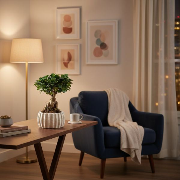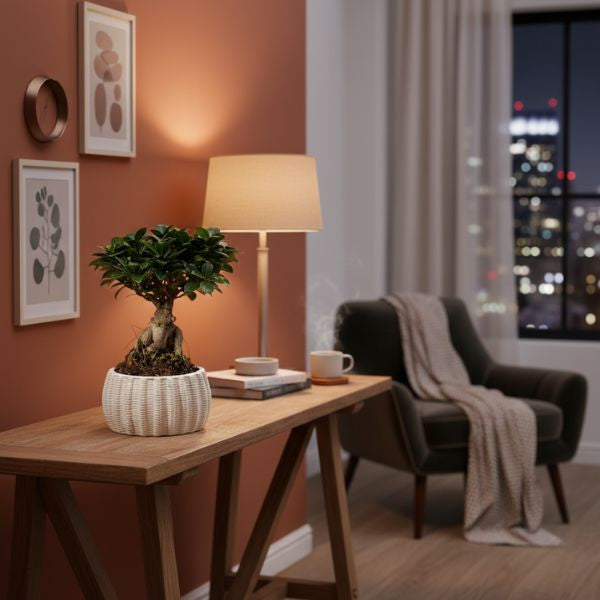 Bonsai ficus ginseng Athena su tavolino marmo in soggiorno moderno con lampada dorata