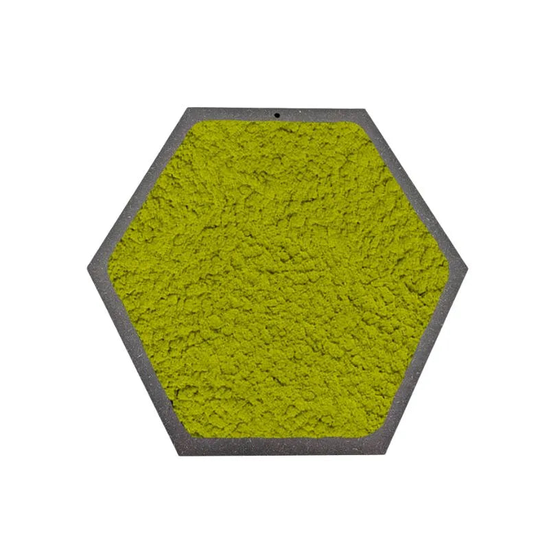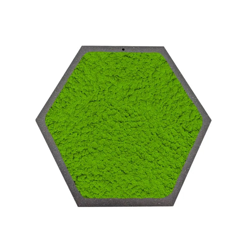 La cornice nera dal profilo pulito esalta la geometria dell’esagono e crea un contrasto elegante che valorizza le diverse sfumature di verde dei licheni.
