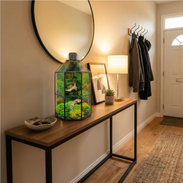 Questo affascinante terrarium a forma di lanterna con muschio stabilizzato è una soluzione decorativa dallo stile naturale e moderno. Composto da muschio naturale in diverse tonalità di verde, elementi di legno e cortecce ornamentali, rappresenta una decorazione green elegante e senza manutenzione.