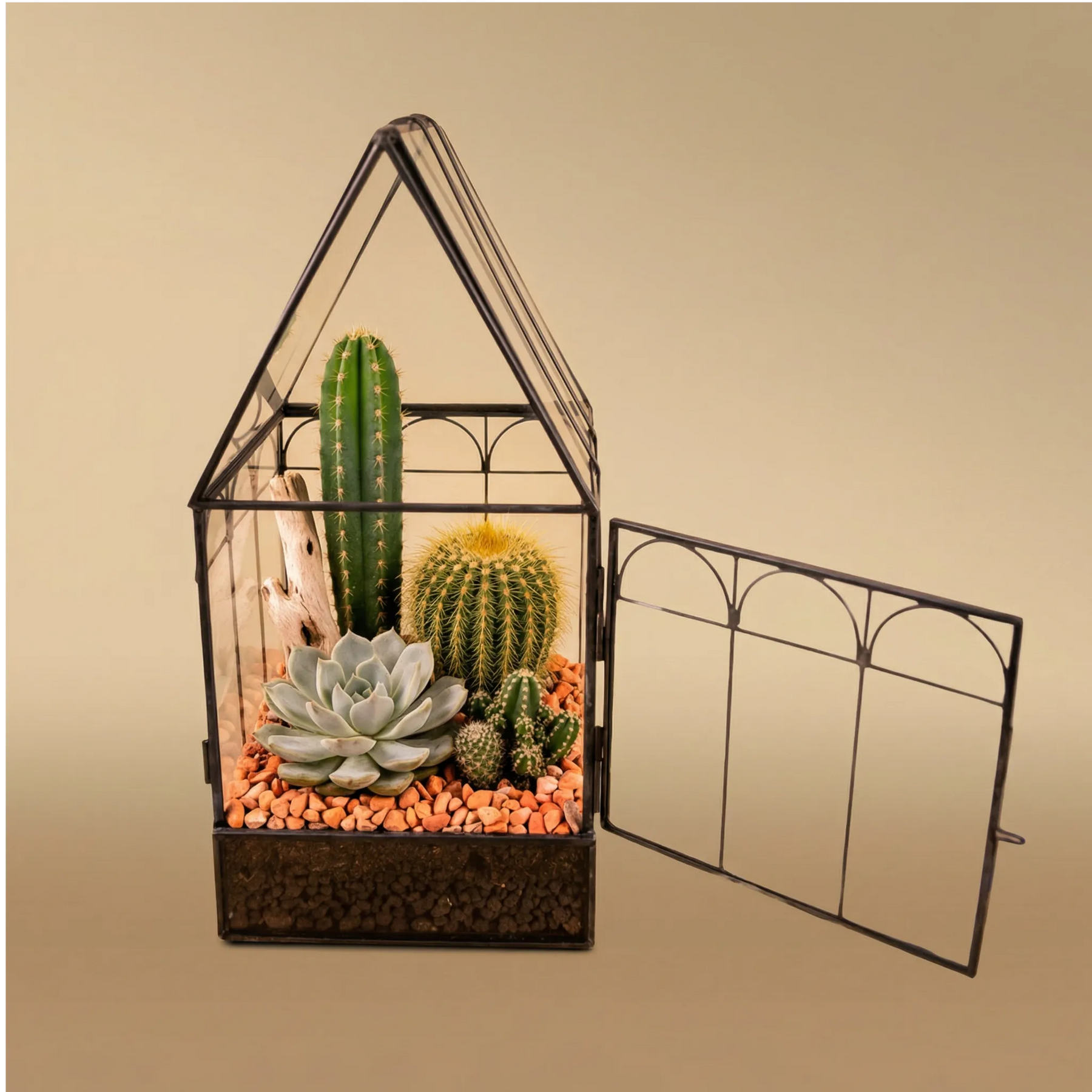 La grazia e l'eleganza si incontrano in questo terrarium mini serra romantica, un piccolo capolavoro che racchiude una selezione curata di piante grasse. Con il suo design delicato e affascinante, questa mini serra si adatta perfettamente a spazi eleganti e raffinati, diventando un pezzo decorativo che non passa inosservato. Le piante da interno, come cactus e succulente, sono famose per la loro resistenza e facile manutenzione, ideali per chi desidera un tocco verde senza impegno.