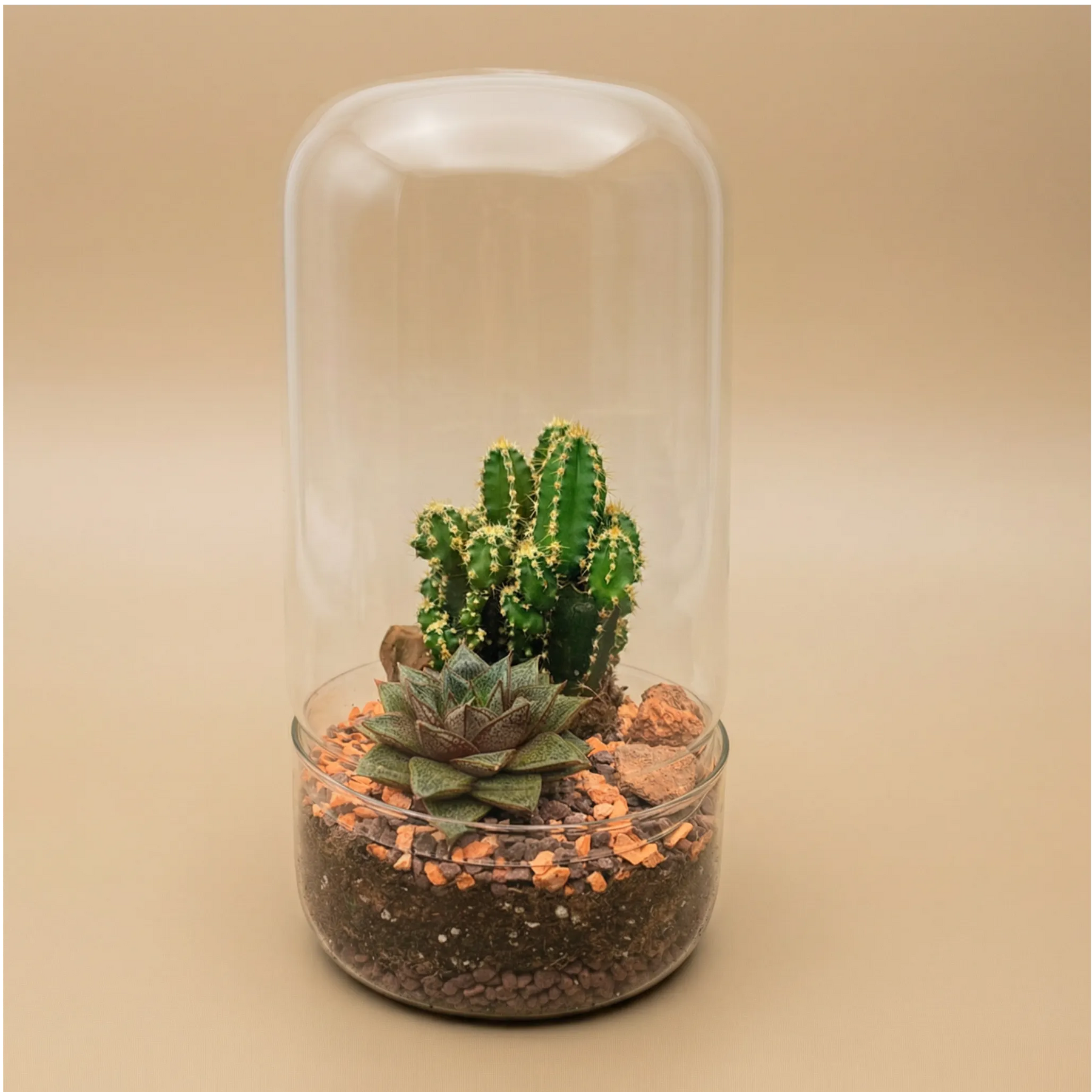 Questo terrarium in vetro con piante grasse unisce estetica contemporanea e semplicità di cura, offrendo una soluzione green compatta per ogni ambiente. Composto da cactus decorativi e succulente, è ideale per chi desidera un tocco naturale con zero stress.