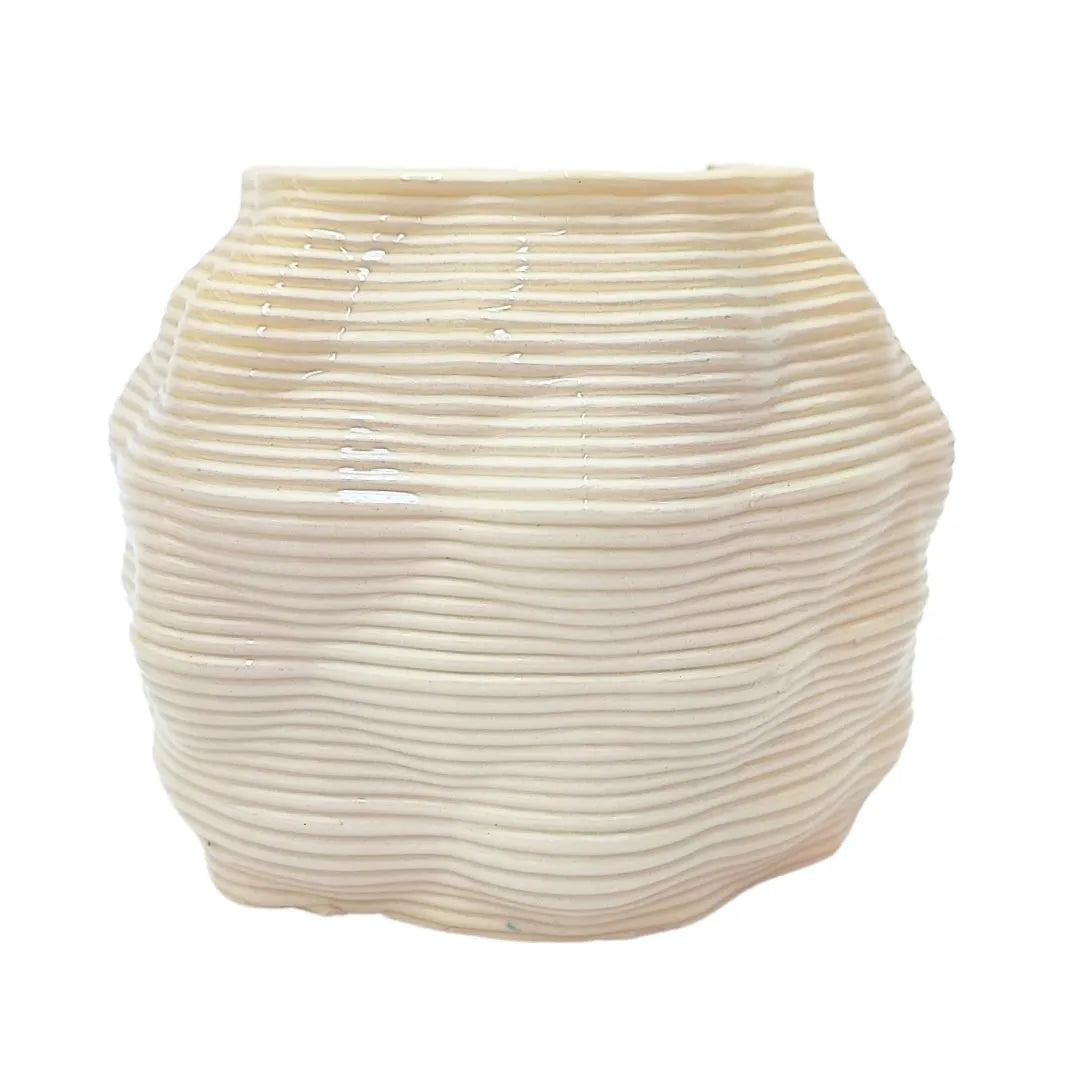 Il vaso “Bangkok” è realizzato in argilla naturale con una lavorazione artigianale che ne esalta l’aspetto grezzo e contemporaneo. Le sue linee irregolari e ondulate, abbinate alla finitura lucida e rigata, conferiscono un tocco autentico e dinamico a qualsiasi ambiente. Grazie alle dimensioni compatte è ideale per piante da interno, piccole succulente o composizioni botaniche minimaliste. La texture unica rende ogni pezzo un elemento di arredo unico nel suo genere.