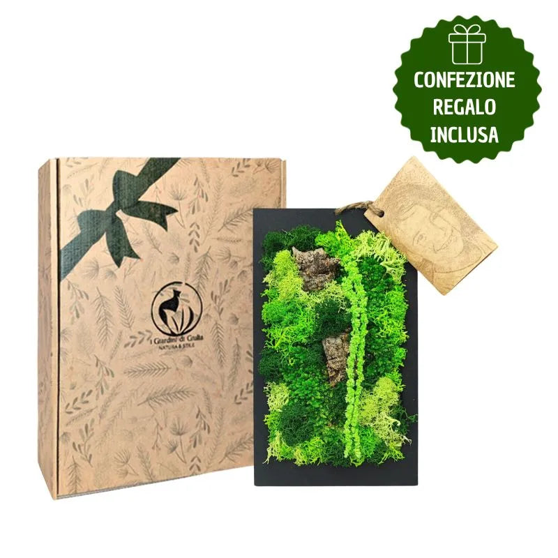 Realizzato con muschi e licheni stabilizzati di alta qualità, mantiene nel tempo colore, morbidezza e bellezza senza necessità di acqua, luce diretta o cure particolari. La composizione, equilibrata e curata nei dettagli, offre un effetto green naturale perfetto per chi desidera integrare la natura negli interni in modo semplice ed elegante.