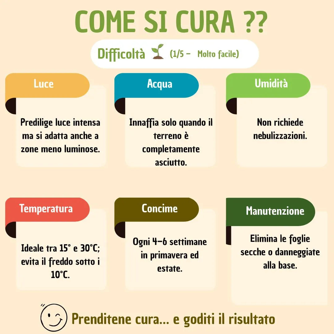 Estremamente adattabile, cresce bene anche in condizioni di luce medio-bassa e richiede annaffiature minime. Contribuisce inoltre a migliorare la qualità dell’aria grazie alla sua capacità di assorbire alcune sostanze nocive, rendendola adatta anche a spazi chiusi e ambienti di lavoro.