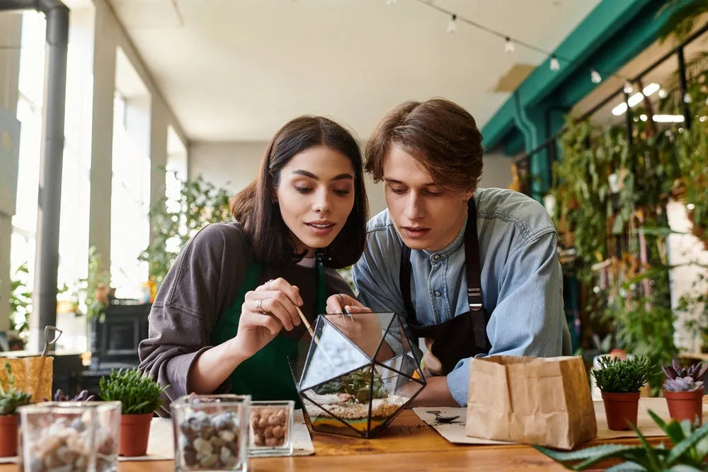 Stratifichi argilla espansa, carbone e substrato; rifinisci con le sabbie decorative. Inserisci la tua pianta preferita (tropicale: fittonia, peperomia, pilea; arido: piccole succulente) e completa il layout.