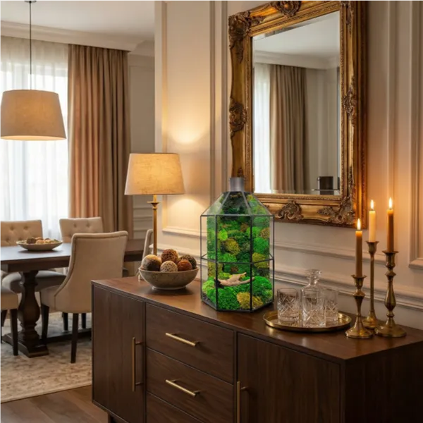 Questo terrarium in vetro con muschio stabilizzato è un raffinato complemento d’arredo, pensato per portare la bellezza della natura negli spazi interni senza necessità di manutenzione. Grazie alla sua struttura ampia e slanciata, si adatta perfettamente a ambienti moderni e green-friendly, valorizzando ogni angolo con un tocco naturale e armonioso. All’interno, il muschio naturale stabilizzato è disposto su più livelli, creando un suggestivo paesaggio tridimensionale. Elementi decorativi come corteccia e pietre naturali completano la composizione, rendendo questo oggetto una vera opera vegetale ecosostenibile.