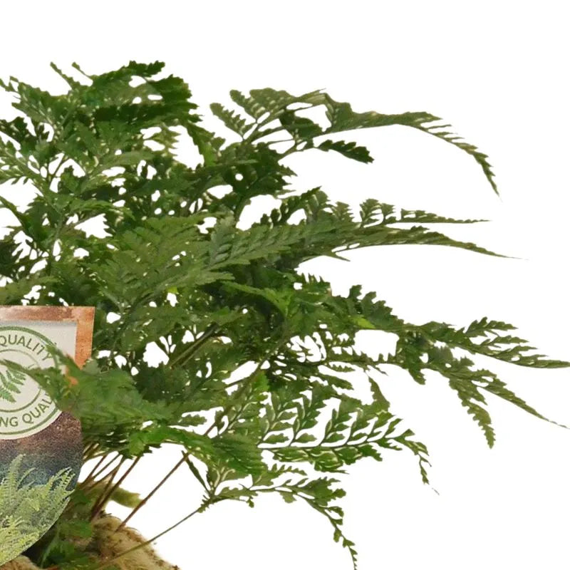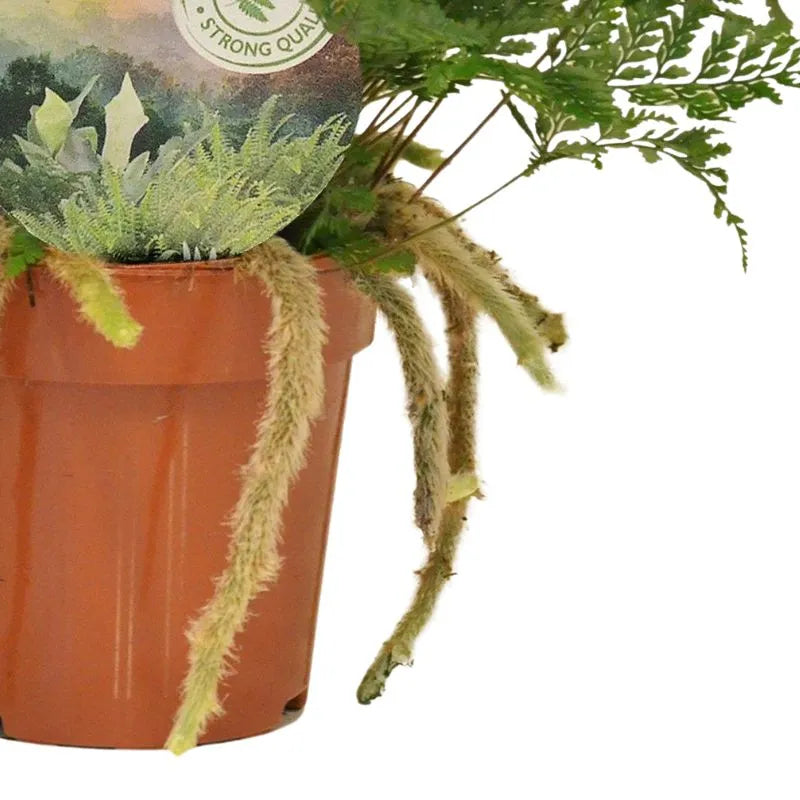 La Felce Humata tyermannii è una pianta da interno elegante e decorativa, riconoscibile per il suo fogliame leggero e per i caratteristici rizomi pelosi che si sviluppano in superficie, donandole un aspetto naturale e scenografico. Grazie alle dimensioni compatte del vaso, è ideale per mensole, tavolini e piccoli spazi verdi.
