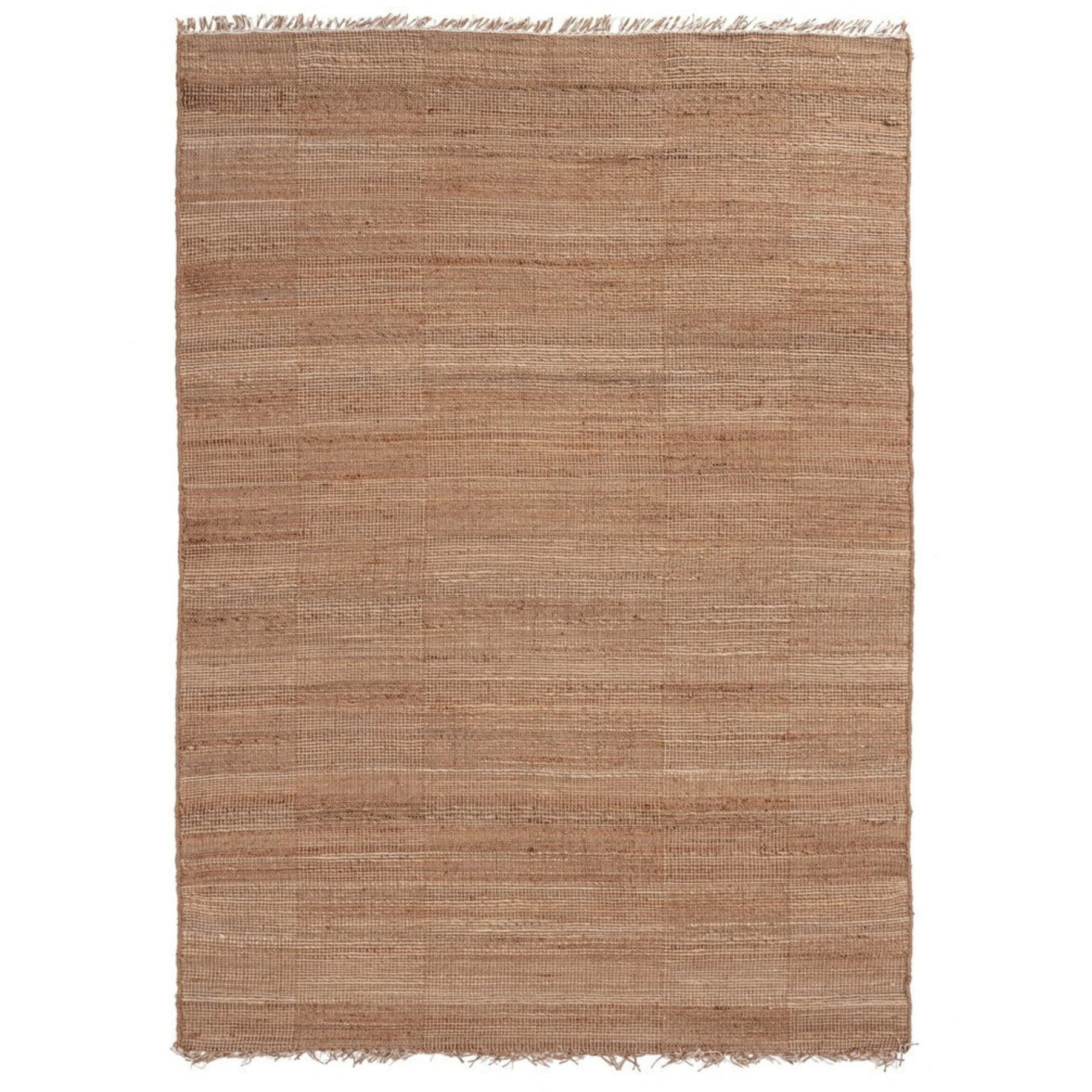 Tappeto rettangolare in juta naturale con motivo a intreccio rosa e frange sui lati corti, design rustico e artigianale.