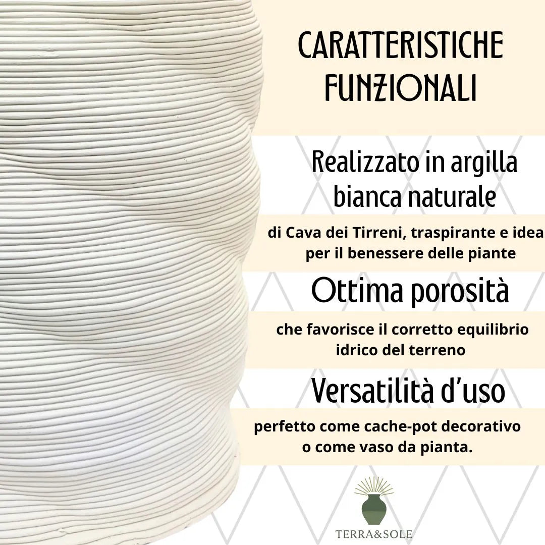 Il vaso Calipso della collezione Terra&Sole è una creazione artigianale in argilla bianca naturale di Cava dei Tirreni, caratterizzata da un design dinamico e fluido. Le linee ondulate, disposte in un elegante movimento a spirale, conferiscono un effetto scenografico e contemporaneo, perfetto per arricchire qualsiasi ambiente con armonia e stile.