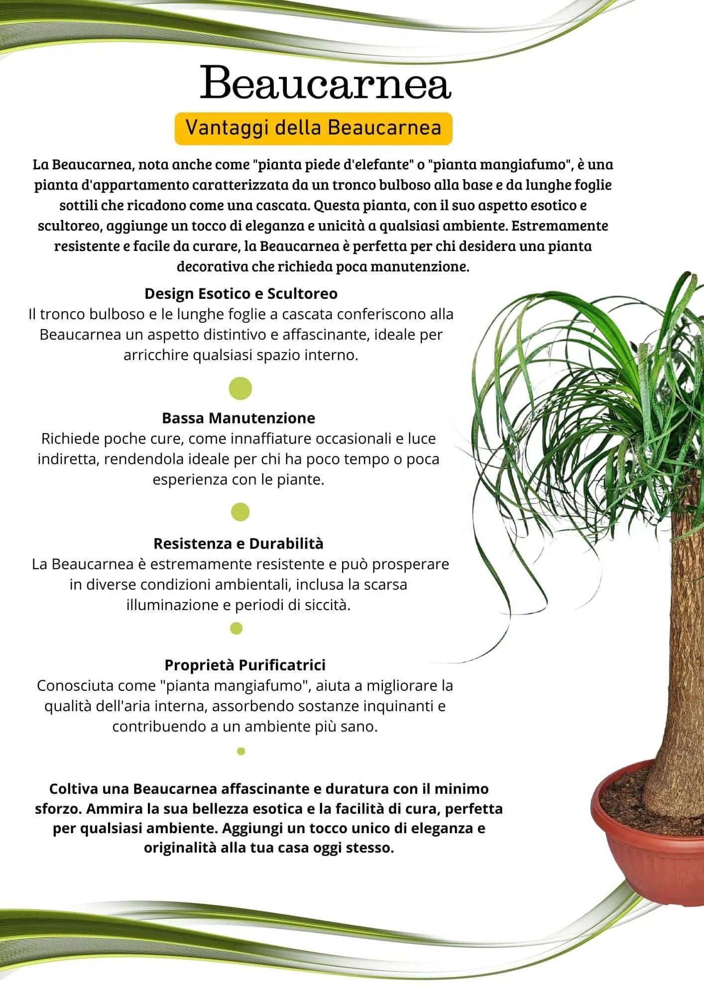 Appartenente alla famiglia delle Asparagaceae, la Beaucarnea è apprezzata non solo per la sua estetica, ma anche per le sue qualità funzionali: purifica l’aria, richiede poche cure ed è estremamente resistente, grazie alla sua capacità di immagazzinare acqua nel fusto.