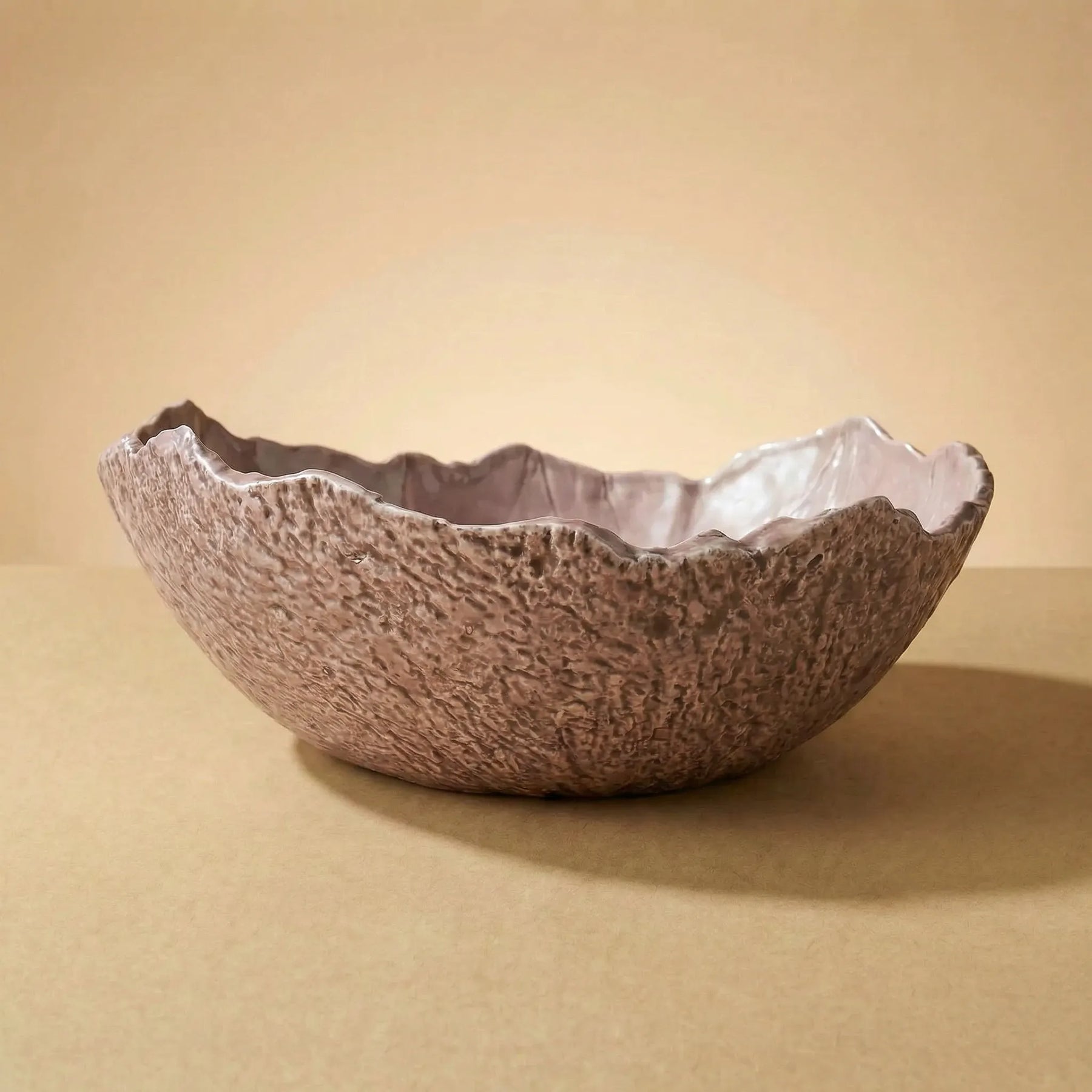Vaso ciotola artigianale XL in ceramica è un complemento decorativo di grande presenza, caratterizzato da una superficie materica effetto roccia e da un bordo irregolare che richiama forme naturali. La lavorazione artigianale rende ogni pezzo unico, con variazioni di texture e sfumature che ne esaltano il valore estetico.