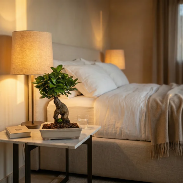 Posiziona il tuo Bonsai Ficus Ginseng in un luogo luminoso all'interno, lontano dalla luce solare diretta e da fonti di calore o freddo eccessivo. Un bonsai con vaso in ceramica si adatta a molti ambienti.